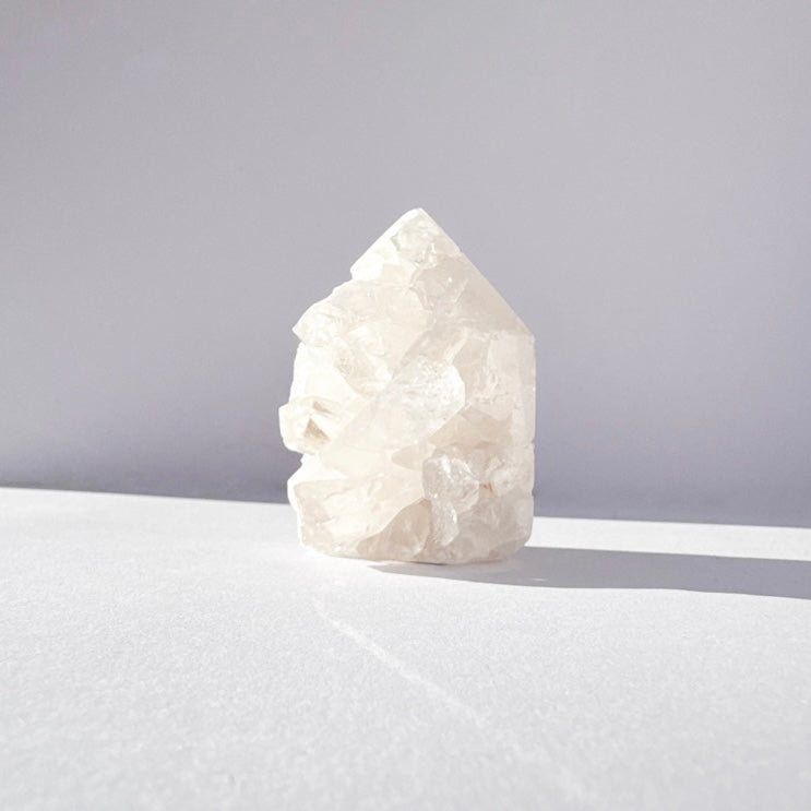A natural Clear Quartz tower with exposed crystal growth through the body.