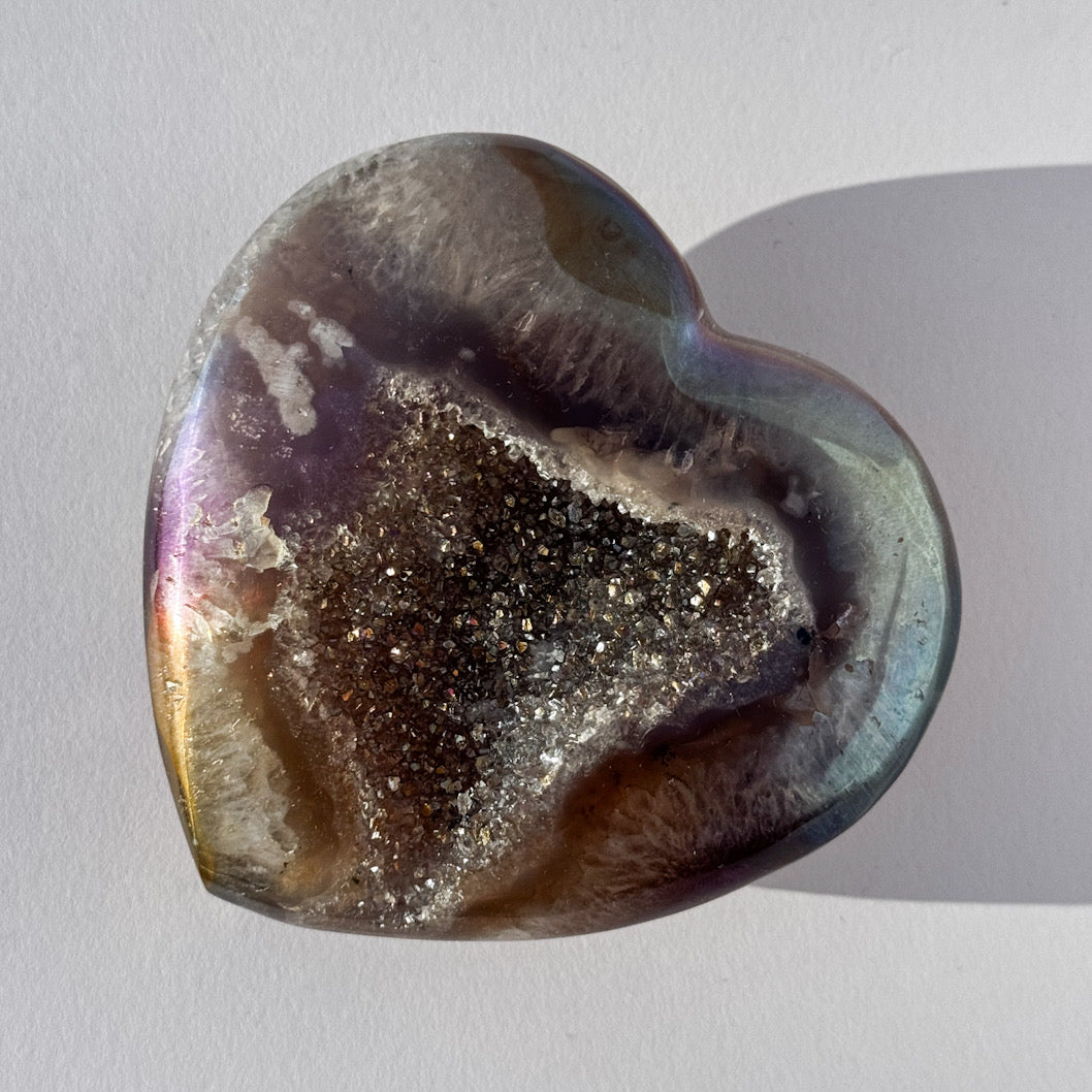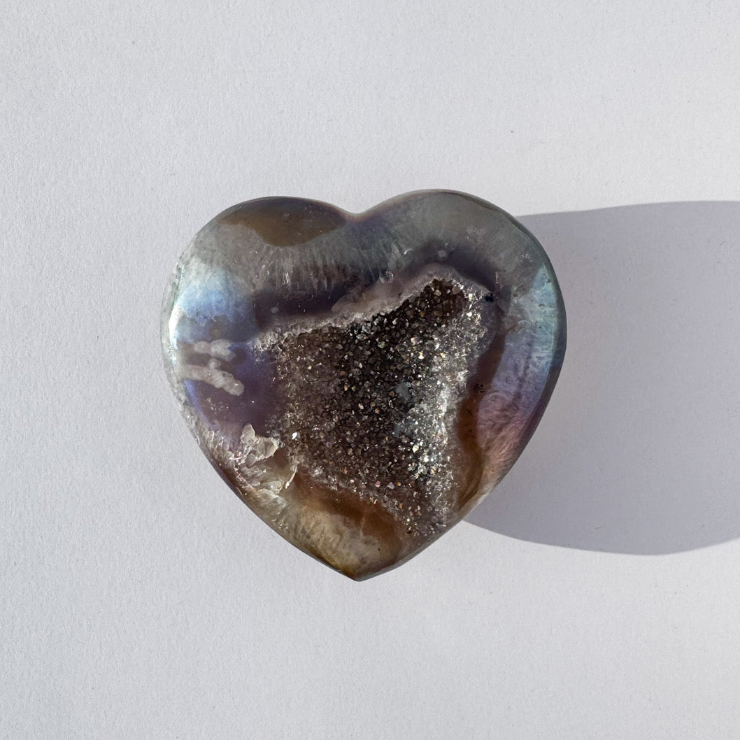 A high-gloss, light-catching heart carved from natural agate and finished with a soft aura sheen. The centre holds an exposed druzy pocket - your built-in energy filter - designed to break up heaviness, neutralise emotional static, and help your system reset to clarity.