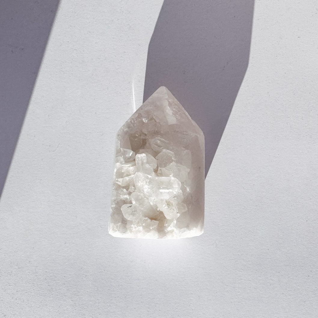 A natural Clear Quartz tower with exposed crystal growth running through the body.